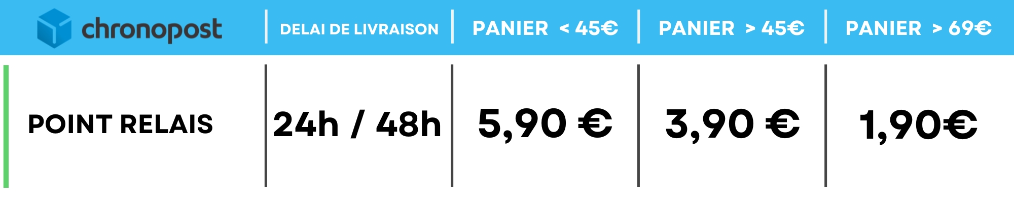 - Chronopost : 24 à 48h ouvrées